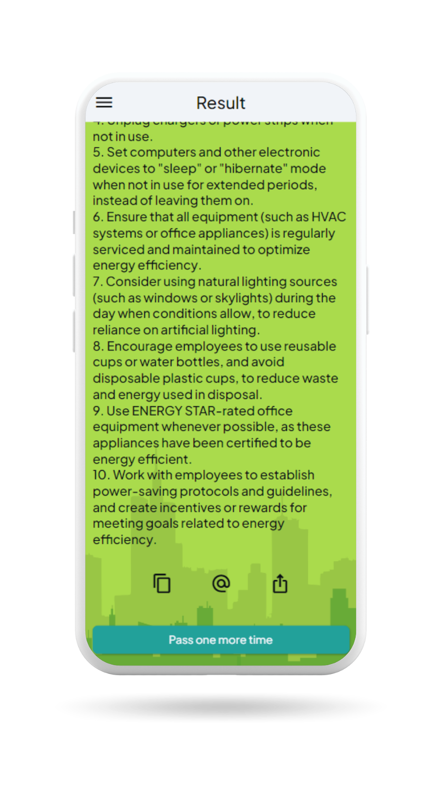 The application works by asking the user a series of questions to identify environmental problems generated in the workplace. Based on the information gathered, the Environmental Generator selects individual and personalised solutions that the user can implement to reduce their environmental impact.